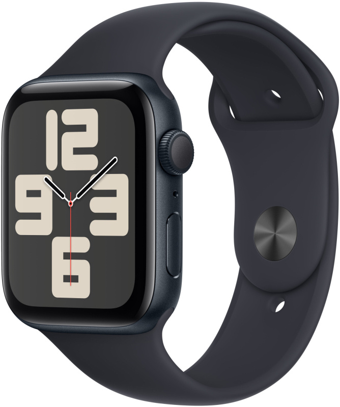 Apple Watch SE 2023, 44 мм, корпус из алюминия цвета «тёмная ночь», силиконовый спортивный ремешок цвета «тёмная ночь»