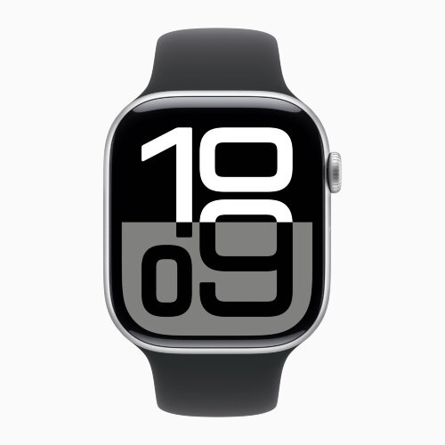 Apple Watch Series 10 42 мм, серебристый алюминий, силиконовый спортивный ремешок черного цвета